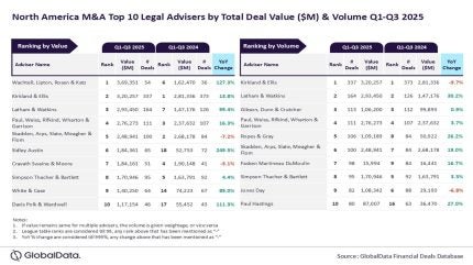 Wachtell, Lipton, Rosen & Katz et Kirkland & Ellis sont devenus les meilleurs conseillers juridiques en fusions et acquisitions (M&A) en Amérique du Nord en termes de valeur et de volume, respectivement, pour les trois premiers trimestres de 2025.